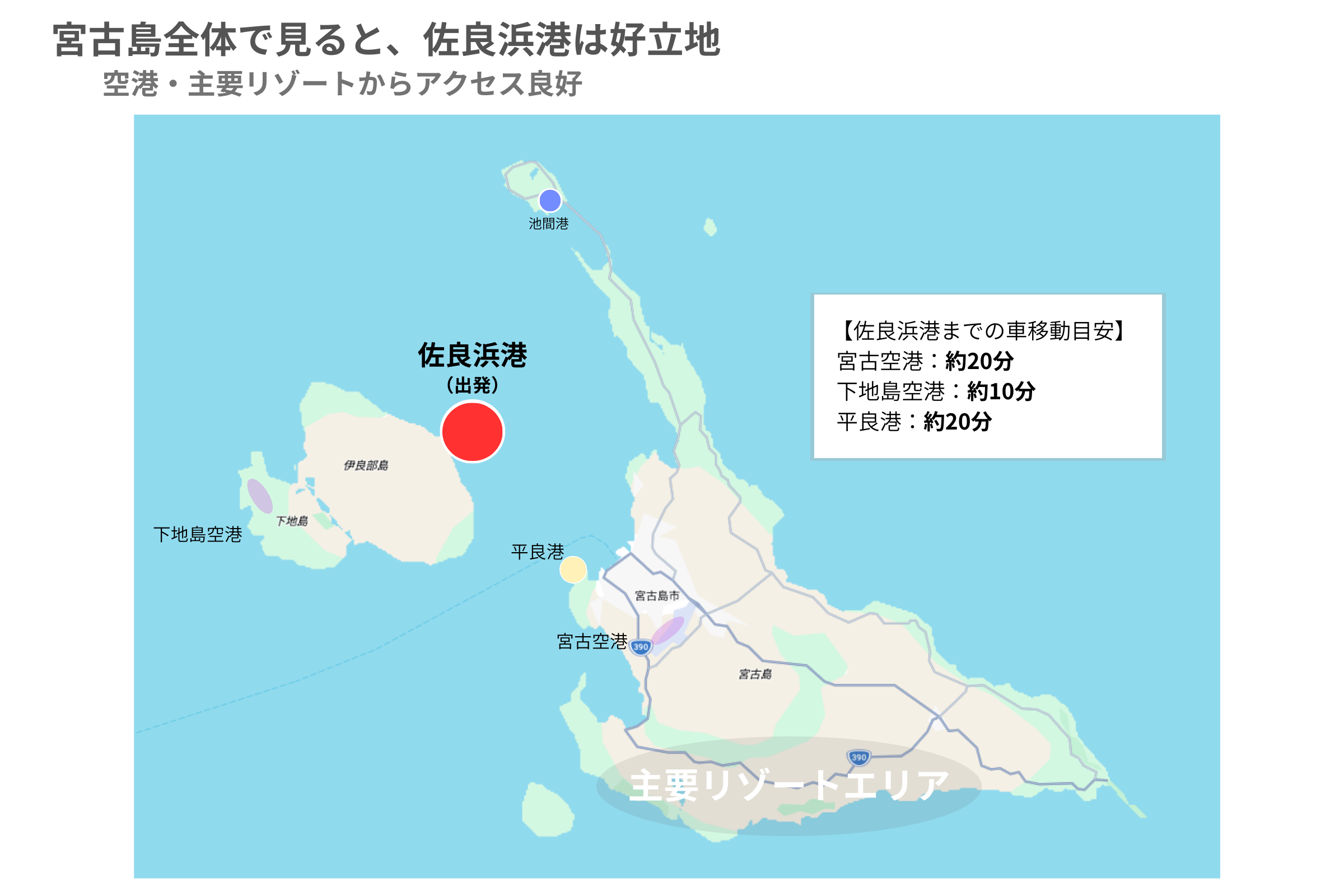 しかし、宮古空港・下地島空港・平良港・主要リゾートホテルからの車移動を含めた総移動時間で考えると、佐良浜港は非常にアクセスしやすい立地にあります。