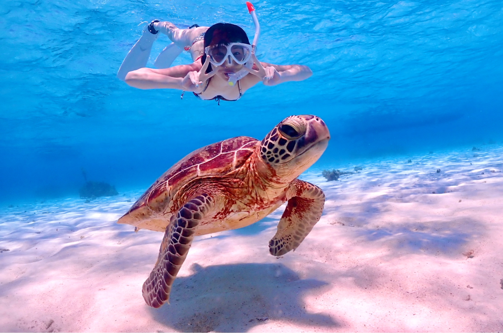 突き抜けるような透明度をウミガメと優雅に泳ぐ時間は至福そのものです。