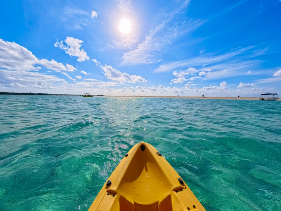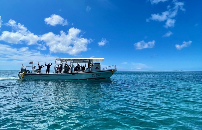 ユニの浜の近くまではボートで移動し、そこからシーカヤックやSUPに乗り換えて、いざ幻の島へ!